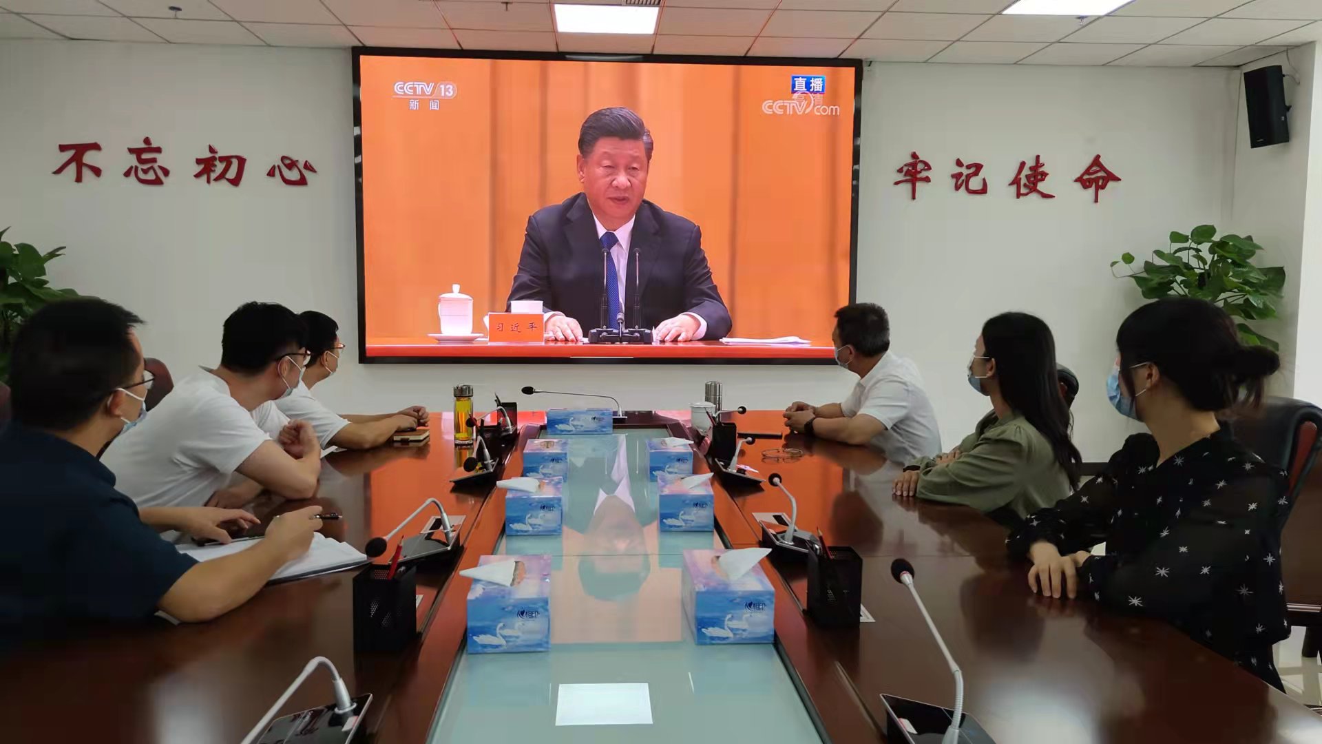 跟著直播大會現(xiàn)場的節(jié)奏,大家起立、肅穆,共同奏唱了國歌,認真聆聽了習近平總書記在大會上發(fā)表的重要講話精神。